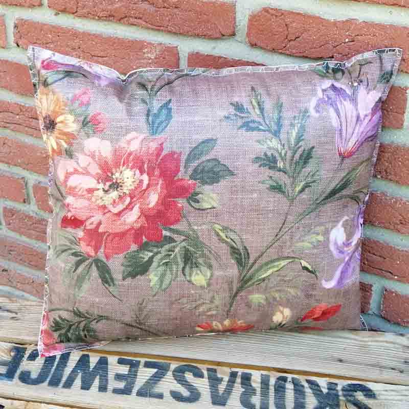 Braunes Kissen mit Blumen aus Wachstuch