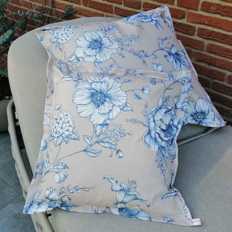 Dieses Kissen mit blauen Blumen ist aus beschichteter Baumwolle von Hand gefertigt und in vier Größen verfügbar – somit finden Sie immer genau die richtige Größe für Ihren Loungebereich, zur Deko im Garten oder in Haus und Wohnung.