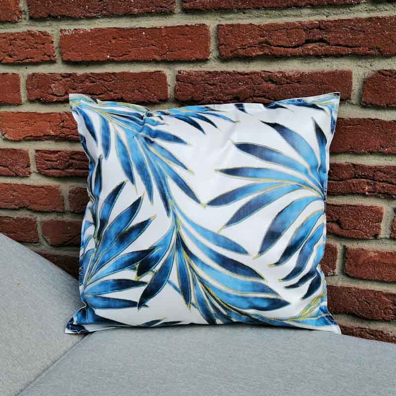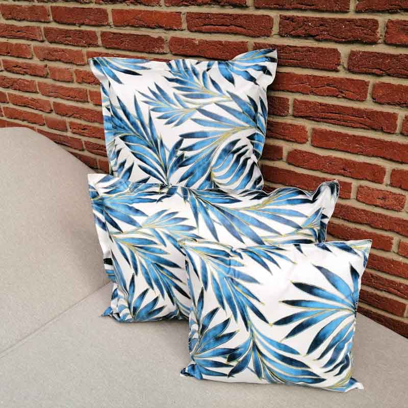 Dieses Kissen mit Palmenblättern hat einen weißen Hintergrund und ist mit großen Palmenblättern bedruckt. Die Palmenblätter haben eine Schattierung in blau mit grauen bis dunkelgrauen Tönen. Die Haptik des Kissens ist glatt – ein Dekokissen für den Outdoorbereich. Die großen Prints mit Palmenblättern wirken sehr hochwertig. Finden Sie damit die richtige Ergänzung zu Ihrem Stil im Garten oder auf dem Balkon.