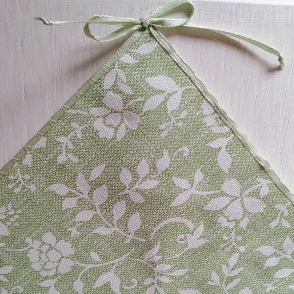 Die Mitteldecke ist mit einer grünen Ziernaht umnäht und hat ein Schleifchen an einer Ecke.