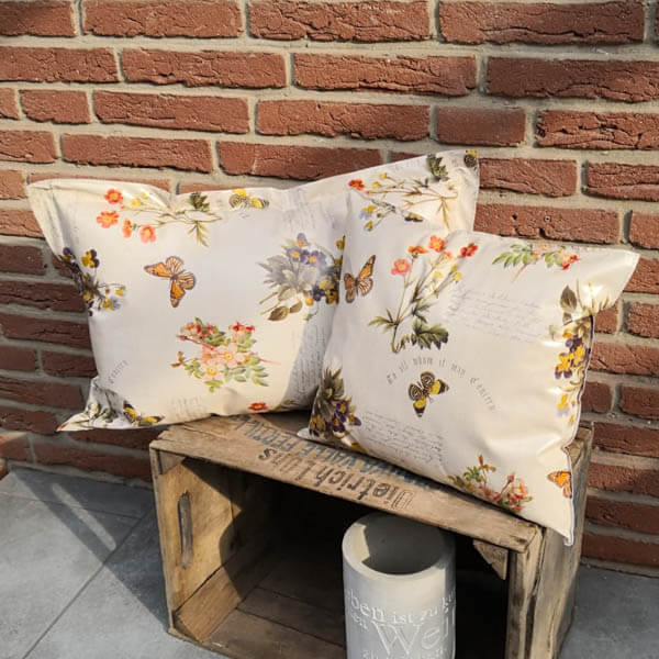 Die Kissen sind mit einer Ziernaht komplett umnäht und daher wasserabweisend, abwaschbar und zu jeder Jahreszeit verwendbar. Die Füllung besteht aus einem eingenähten Kissen, das nicht separat entnehmbar ist. Das bedeutet, dass die Kissen auch bei einem Sommerregen oder sogar im Winter bei Schnee draußen stehen können, sie sind robust gefertigt und trotzen schlechtem Wetter.