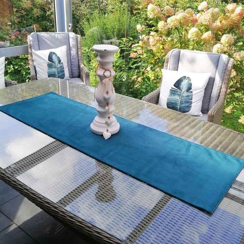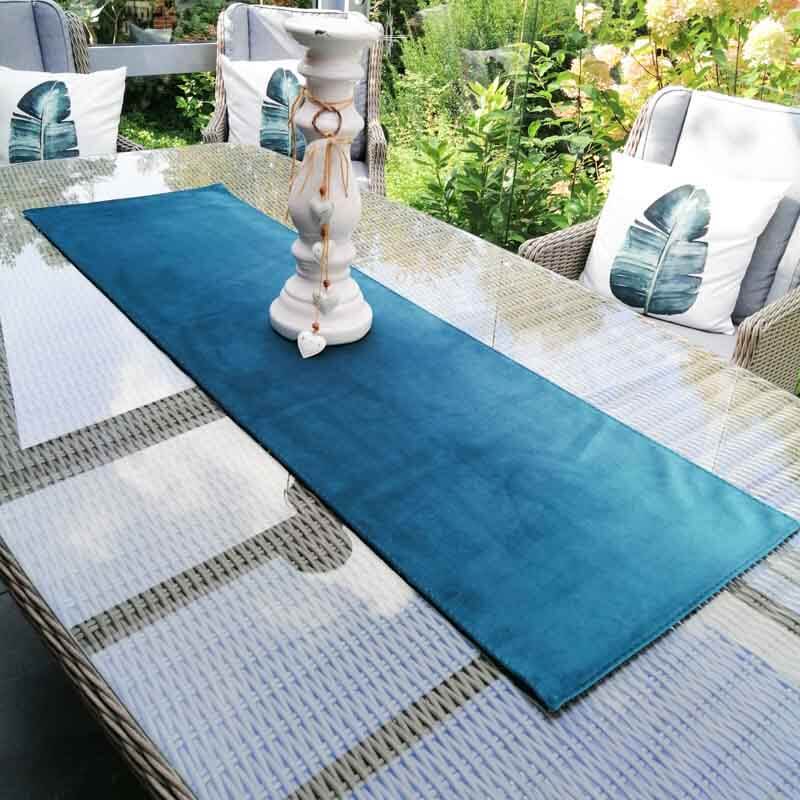 Große Kerzenleuchter, edles Besteck und schöne Gläser zum Essen – was passt da besser als ein stilvoller Samt Tischläufer in Petrol, der Trendfarbe schlechthin zur Zeit? Die Tisch Deko sollte ein Gesamtkonzept ergeben und zu Raumdeko, Sofa oder Stühlen passen und dieser Tischläufer rundet das edle Ambiente stilvoll ab.