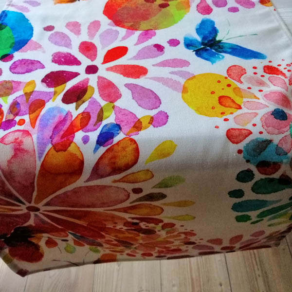 Dieser Tischläufer aus Baumwolle – Blumen mit Schmetterling ist ein toller Eye Catcher auf dem Esszimmer-, Garten- oder Wohnzimmertisch – Ihre Gäste werden begeistert sein. Das Motiv passt toll in die Frühlings- oder Sommersaison, kann aber mit den leuchtenden Farben auch das ganze Jahr dekoriert werden.