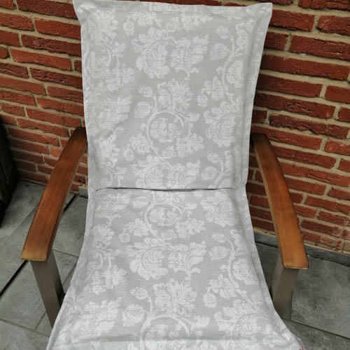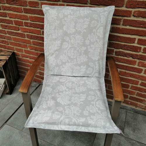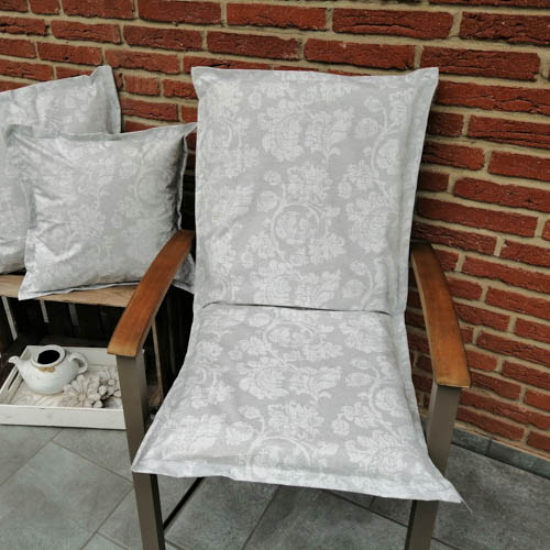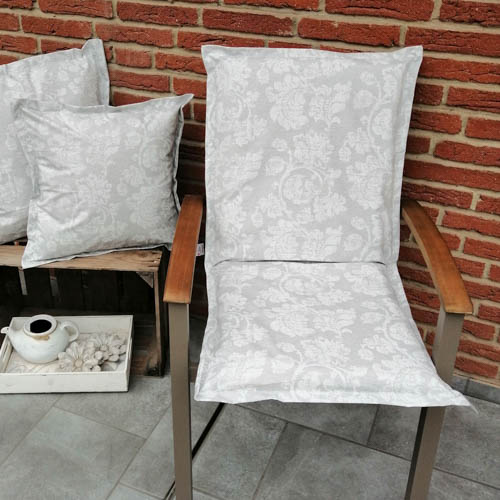 Bitte beachten Sie, dass Sie das Kissen für den Gartenstuhl mit Blätterranken in grau ohne Kissenfüllung kaufen. Die Gartenstuhlauflage ist mit einem Hotelverschluss genäht.