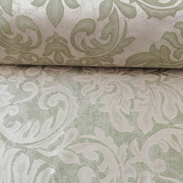 Diese Meterware Grün mit beigen Ornamenten ist beidseitig verwendbar: Beige mit grünen Ornamenten auf der einen Seite, grün mit beigen Ornamenten auf der anderen.