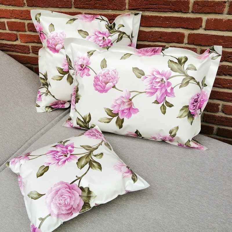 Die Kissen sind mit einer Ziernaht komplett umnäht und daher wasserabweisend, abwaschbar und zu jeder Jahreszeit verwendbar. Die Füllung besteht aus einem eingenähten Kissen, das nicht separat entnehmbar ist. Das bedeutet, dass die Kissen auch bei einem Sommerregen oder sogar im Winter bei Schnee draußen stehen können, sie sind robust gefertigt und trotzen schlechtem, kalten und frostigen Wetter.