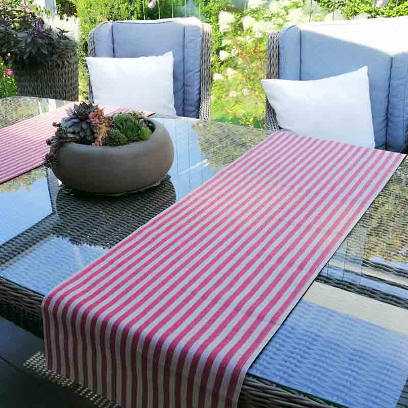 Tischläufer, wie dieser mit dem Muster rot gestreift können Sie als hochwertige Dekoration im Garten, auf der Terrasse oder dem Balkon nutzen. Dieser Tischläufer eignet sich für die Verwendung auf dem Esstisch drinnen oder draußen. Im Frühjahr und im Sommer ist er ein tolles Accessoires auf Ihrem Balkontisch und rundet die Atmosphäre bei einem Grillabend mit Freunden, einer Einladung zum Essen mit der Familie oder einen schönen Abend zu zweit ideal ab!