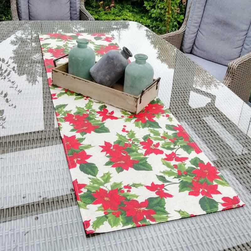 Dieser Tischläufer mit Weihnachtsstern Motiv ist aus beschichteter Baumwolle gefertigt und eignet sich als Unterlage auf einem Esstisch oder dem Wohnzimmertisch und kann auch im Außenbereich, z.B. im Wintergarten genutzt werden. Beschichtete Baumwolle kann abgewischt werden und ist daher für draußen genauso geeignet wie für die kleckernde Familie an Weihnachten. Standardmäßig bieten wir diesen Tischläufer Weihnachtsstern in einer Größe an, wir können aber gerne auch individuelle Maßen schneidern. Kontaktieren Sie uns dafür gerne.